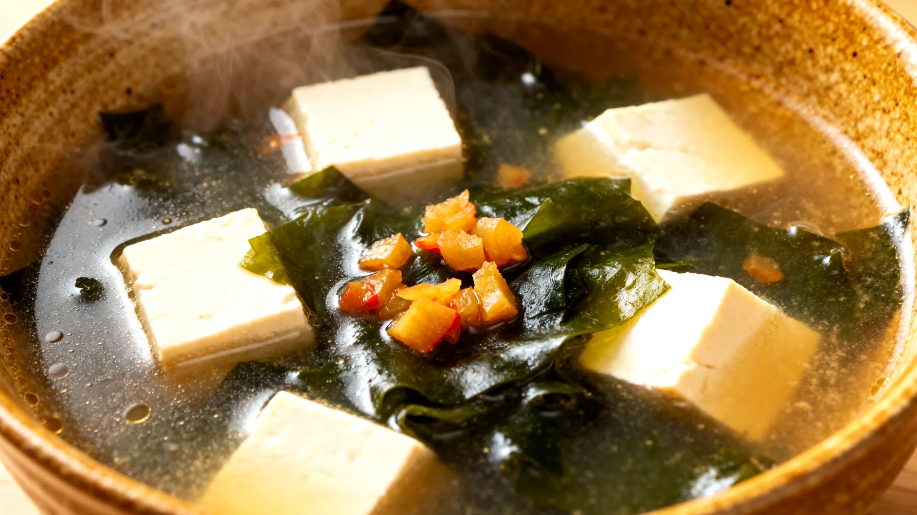 Die dunkelgrünen Wakame-Algen bringen Jod, Kalzium, Magnesium und Eisen in bemerkenswerten Mengen in die Suppe. Gleichzeitig sorgen sie für eine angenehme Textur und einen dezenten Meeresgeschmack. Besonders der Jodgehalt ist erwähnenswert, da Deutschland zu den joddefizitären Regionen gehört. Eine Portion Wakame trägt mit etwa 8 bis 11 Prozent des empfohlenen Tagesbedarfs zur Jodversorgung bei und unterstützt die Schilddrüsenfunktion.
