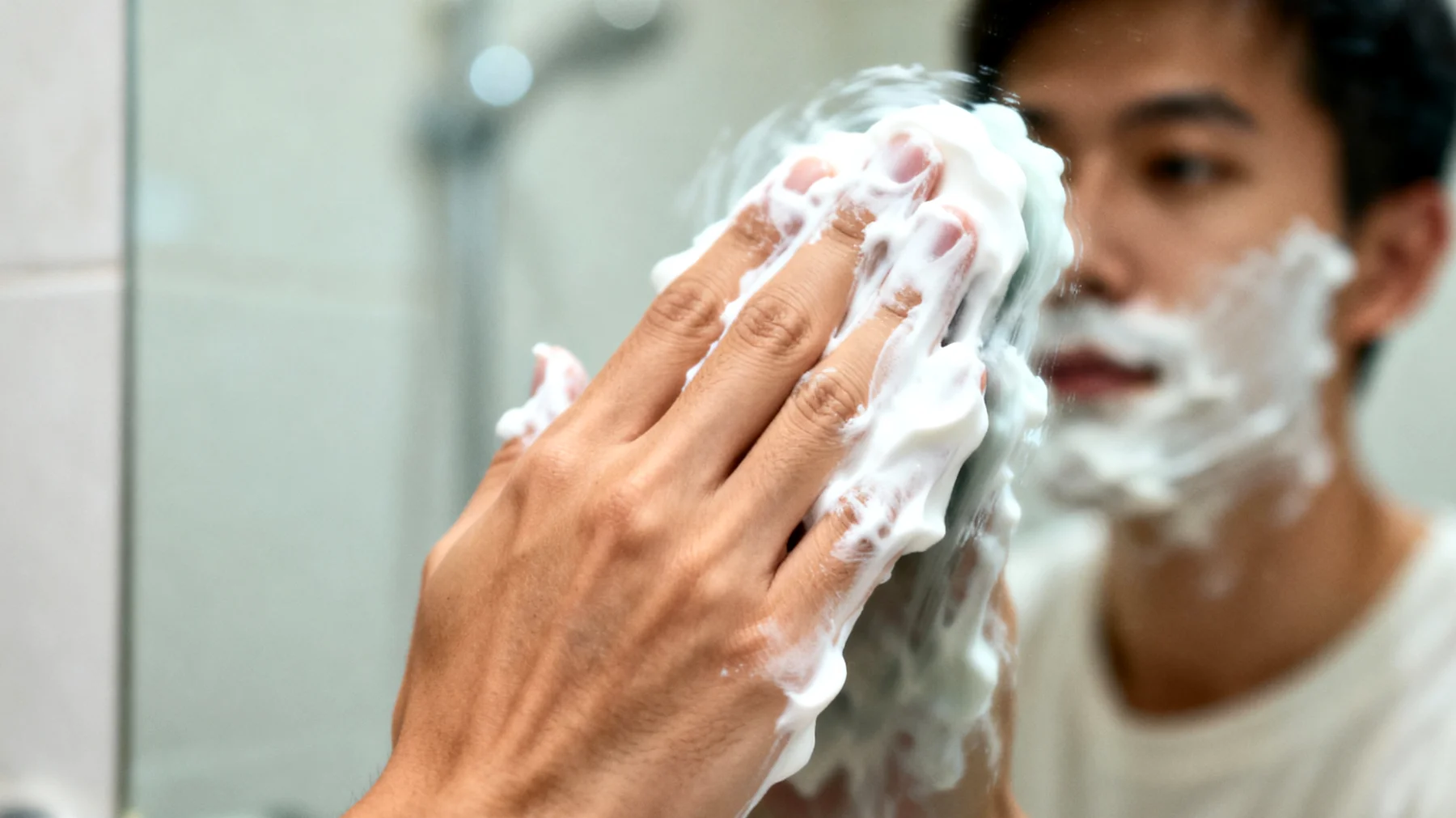 Kondensation ist niemals reines Wasser. Der feine Nebel, der sich auf dem Spiegel niederschlägt, enthält winzige Schwebepartikel, die während des Duschvorgangs in die Luft gelangen: Reste von Seife, Shampoo, Zahnpasta, Hautpartikel. Diese Aerosole verteilen sich im Raum und setzen sich gemeinsam mit dem Wasserdampf auf allen Oberflächen ab. Wenn die Feuchtigkeit verdunstet, bleiben diese Substanzen zurück – zusammen mit mineralischen Bestandteilen aus dem Leitungswasser.